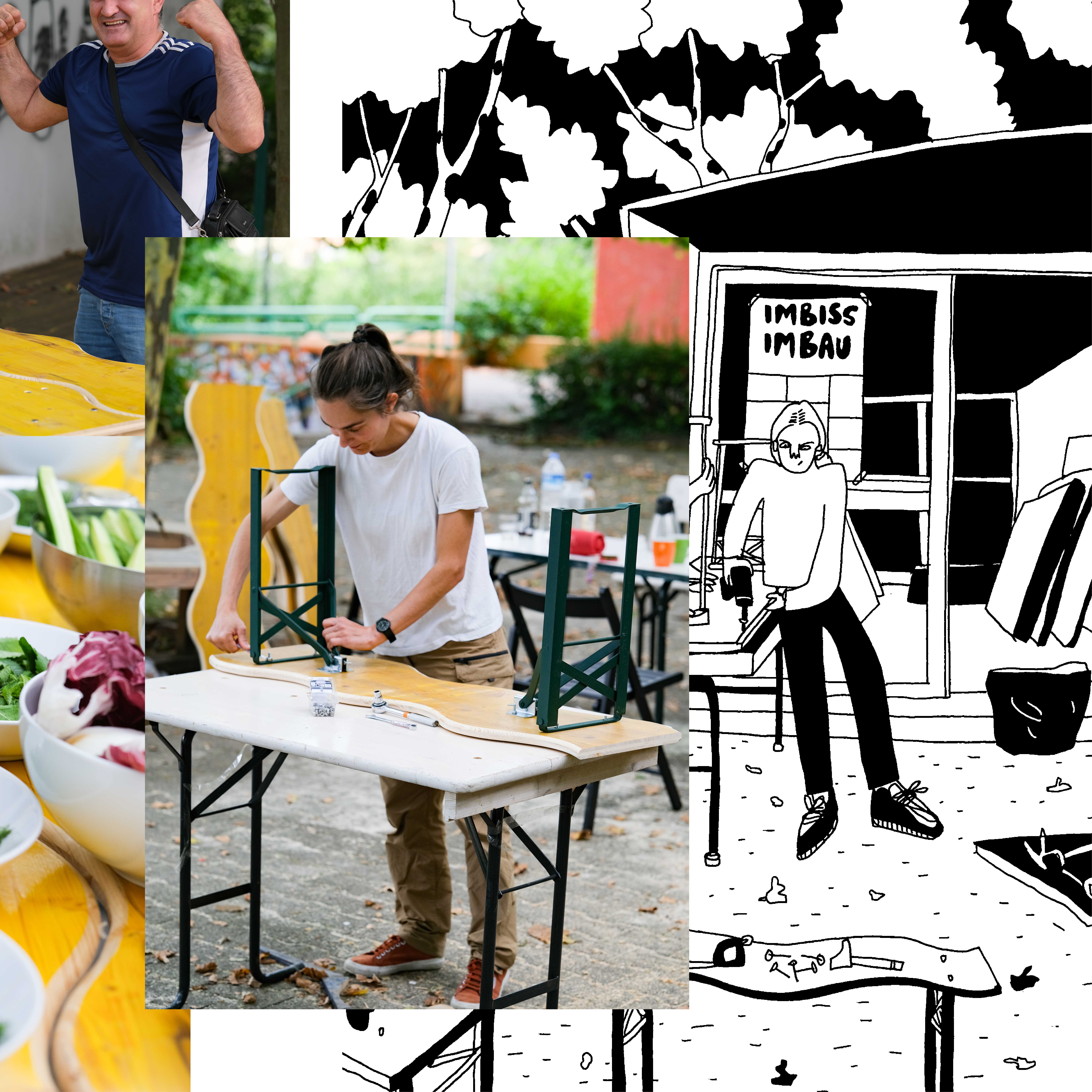 Imbiss-Imbau ist eine Reihe von Workshops und Ausstellung rund um die Frage : ”Wie sieht die Willkommenspraxis in der Gropiusstadt im Jahr 2024 aus?”. Bauen, Kochen, Erzählen, Feiern im öffentlichen Raum werden benutzt, um diese Frage zu beantworten.