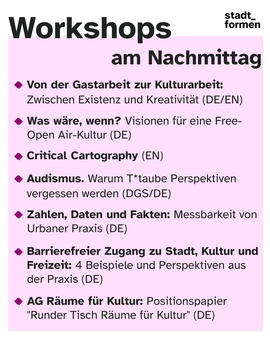 Bei stadt_formen sprechen wir über Urbane Praxis, kulturelle Stadtentwicklung, Freiräume und Draußenkultur – und immer auch über Barrieren: im Stadtraum und in der Kunst- und Kulturproduktion.
