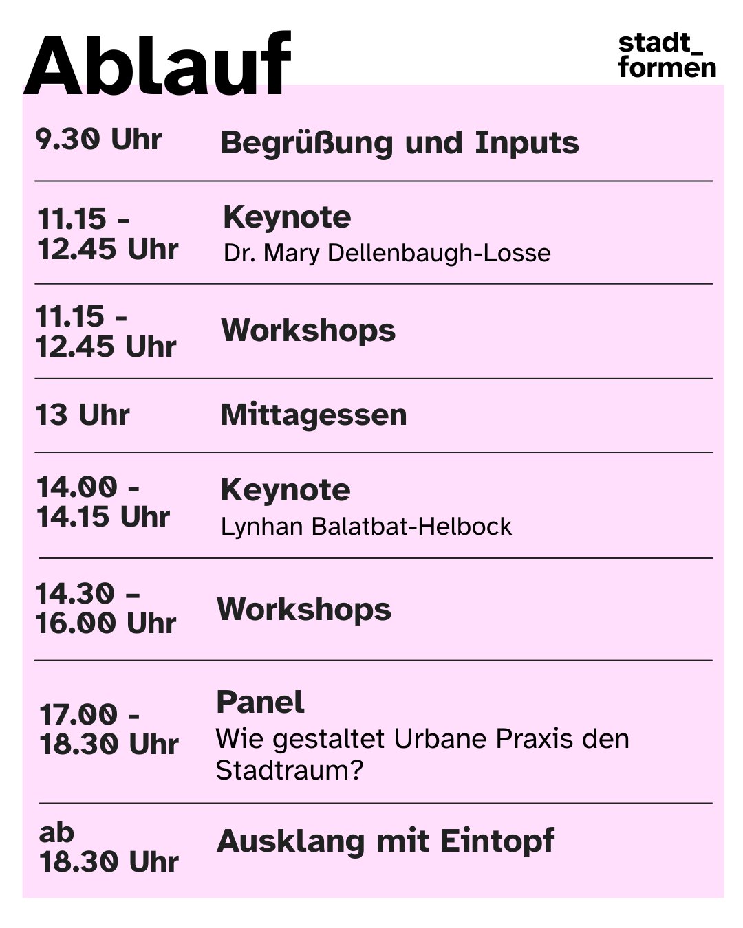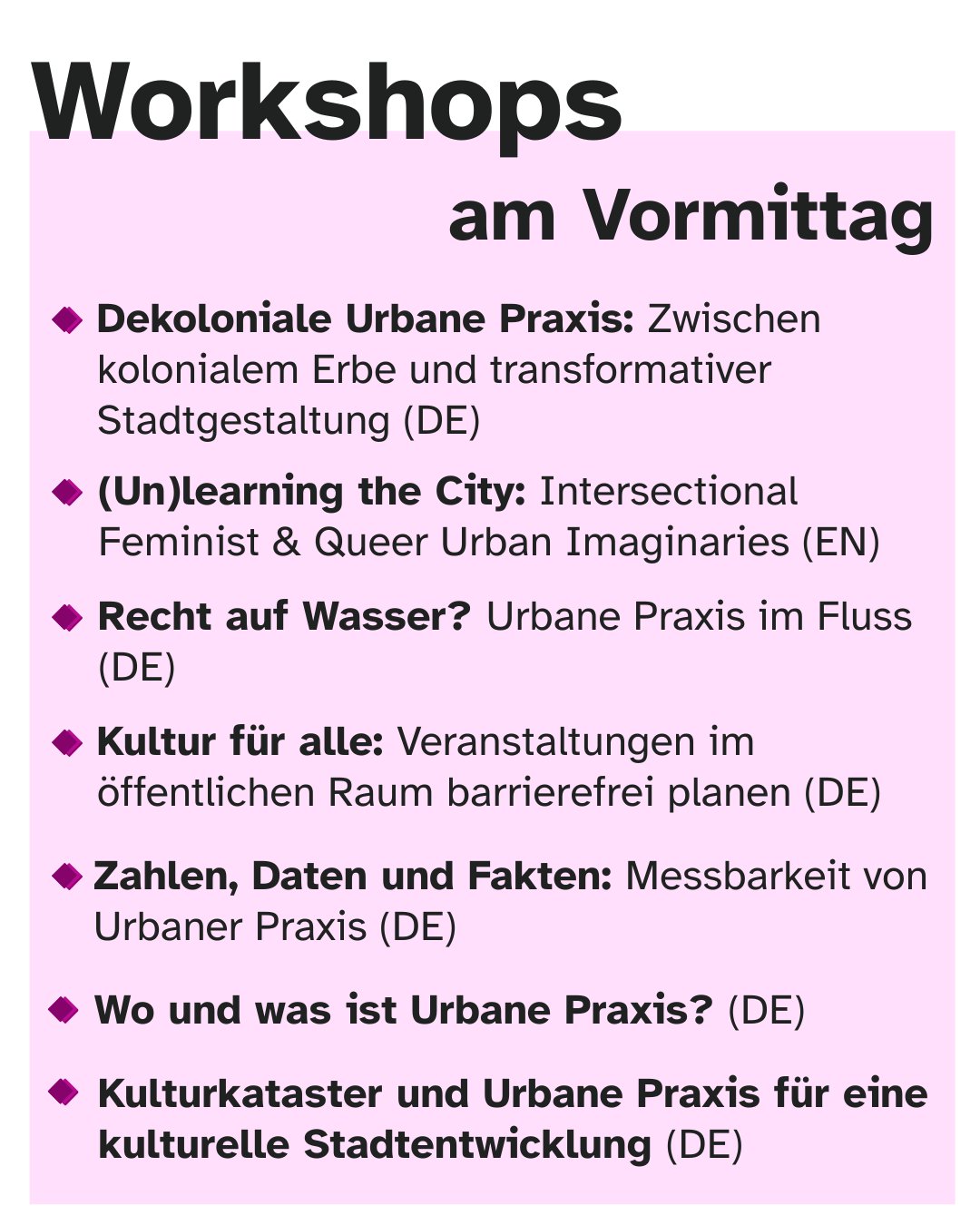 Zusammen diskutieren wir: Wer hat Zugang zu Stadt und Ressourcen? Wie können Barrieren abgebaut werden, um Teilhabe zu ermöglichen? Mit Inputs, Workshops und Panel zu folgenden Themen: Open Air Kultur, 5 Jahre Berliner Projektfonds Urbane Praxis und Status Quo der Urbanen Praxis, Genehmigungspraxis, Zugang zu Stadt und Kulturproduktion, Barrierefreiheit, dekoloniale Ansätze und Erinnerungskultur, Repräsentation und feministische Stadt und Umwelt.
